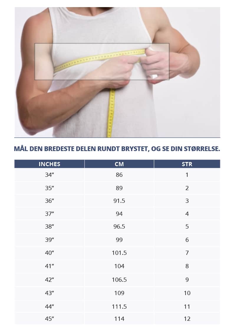 Mål omkrets rundt brystet der hvor omkretsen er størst. Velg utfra dette riktig størrelse i tabellen (størrelse 1 – 12).