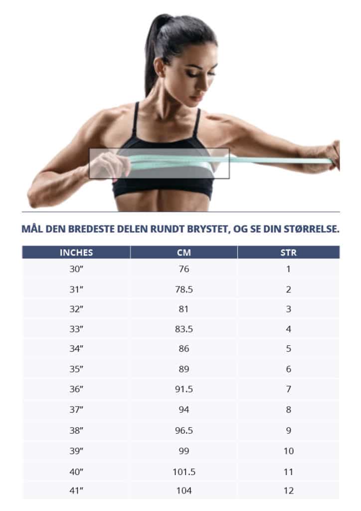 Mål omkrets rundt brystet der hvor omkretsen er størst. Velg utfra dette riktig størrelse i tabellen (størrelse 1 – 12).