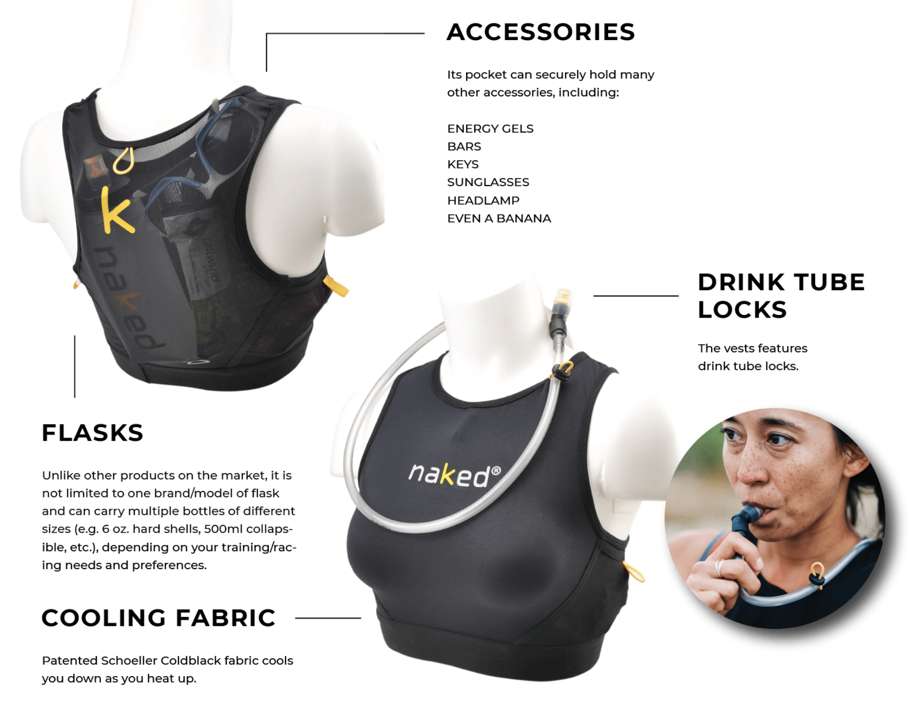 Naked® Running Spra™ er ikke bare en formidabel sports-BH i et komfortabelt og kjølende materiale. Den har også oppbevaringsplass til drikke, mat og annet tilbehør. Mål deg og finn din størrelse i størrelsesguiden.