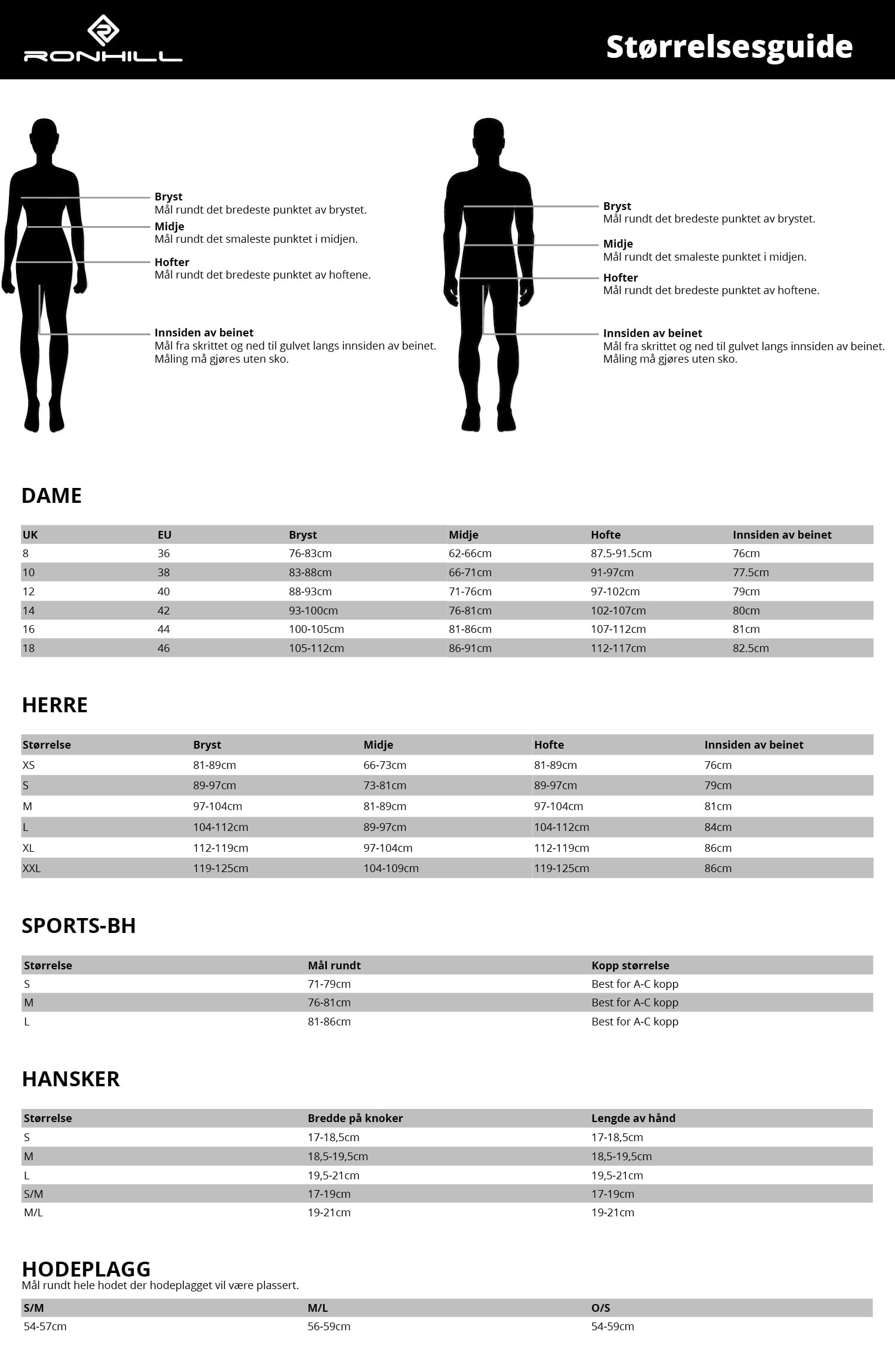 Størrelsesguide for Ronhill-produkter